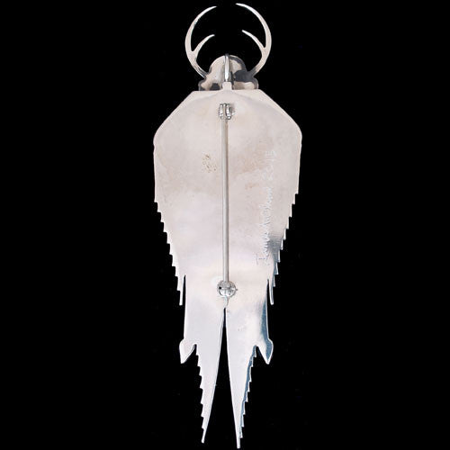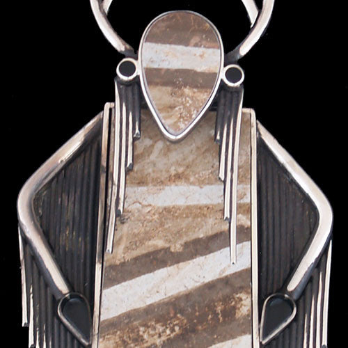 Jamie Olson uses ancient “refuse” to make his wearable sculptures. In this piece, entitled “Deer Standing”, Jamie has utilized a piece of prehistoric pottery originally created between 1050 and 1150 A.D. The ceramics once used by ancient people for cooking and storage were found on private property and are therefore perfectly legal to own. Once utilitarian, now you can wear this pottery piece for beauty.