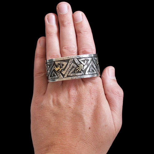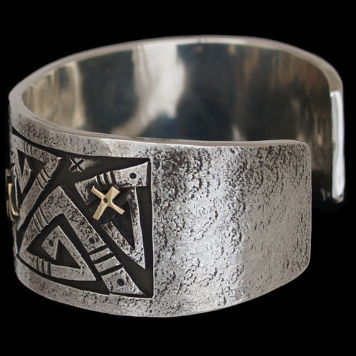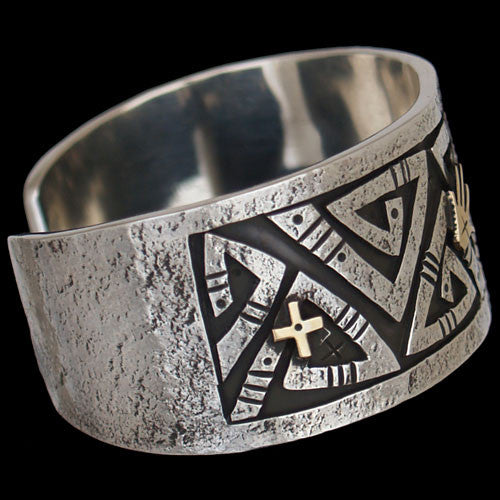 Several layers of heavy-duty sterling silver plate make-up this artsy bracelet by Navajo artist Kee Yazzie Jr. With much hoopla about silver and gold-smithing, Kee has constructed a bracelet for the centuries. To wear this arm band out would take a highly concentrated effort indeed. With a torch, a dimpling hammer and a genius for design and creativity, Kee has placed hand, goat and duality symbols in a cuff for all to admire and appreciate. To wrap this bracelet about your wrist is to experience a cleverness of imagination and a bold depiction of ancient imagery.