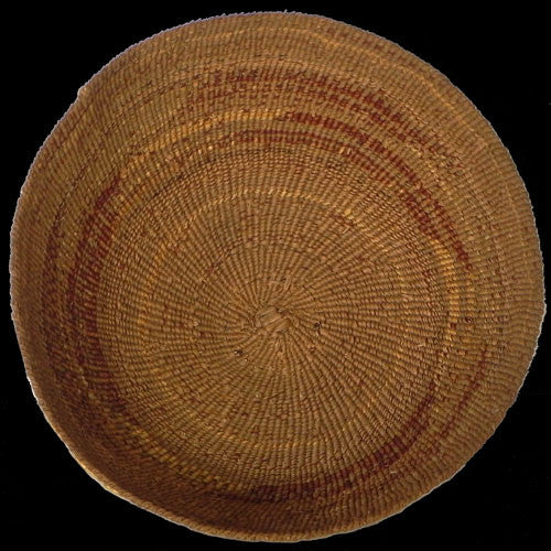 In Northern California, Karok weavers were known for their ceremonial basket hats. This particular weaving dates from around 1900 and features an obsidian blade design. Hazel branches are used for the foundation while bear grass, maidenhair fern woodwardia are used to create the design. Steve and Georgiana Simpson collected this basket.