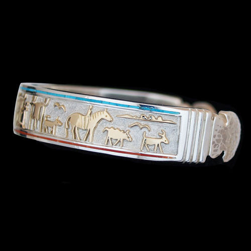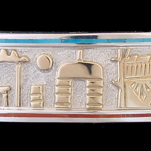Turquoise and coral, silver and gold, land and sky, shepherd and livestock; these are combinations as old as Navajo culture itself. Robert Taylor combines all these elements to make one extraordinary man’s bracelet. Robert’s sense of humor is as well developed as his silversmithing skills, so you get a humorous commentary on Navajo lifestyle in a cuff you will treasure the rest of your life, and maybe into the afterlife.