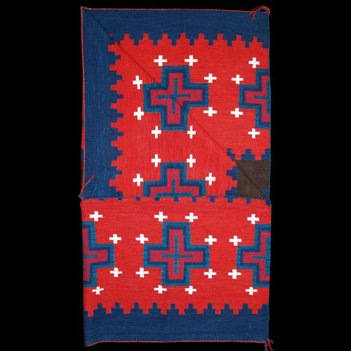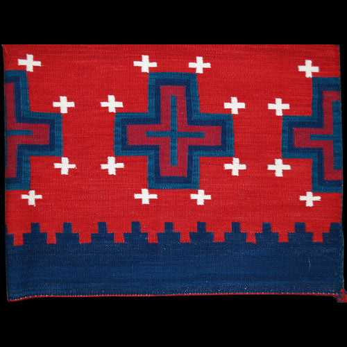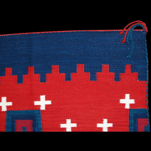 Navajo weaver Nellie Dean, of Cove, Arizona wove this marvelous woman's manta. The design replicates a classic period of Navajo woman dress patterns with Puebloan influence. The natural indigo and cochineal colors are hand-dyed, as are the aniline colors. The white is completely natural. The warp and weft wool is from the Churro sheep.