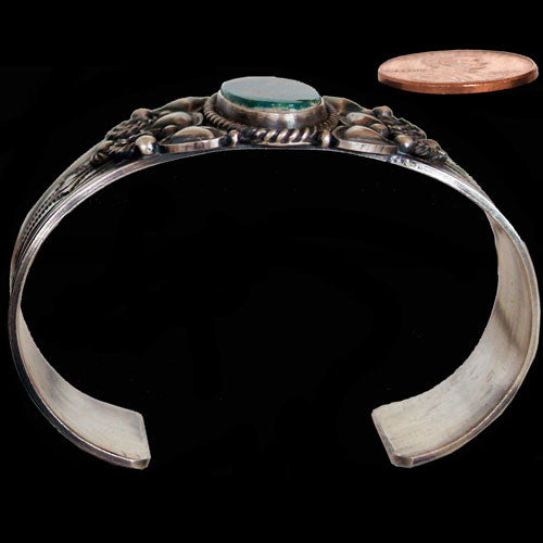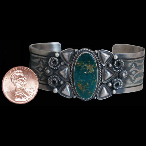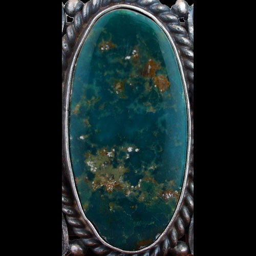 This heavily embossed, sterling silver bracelet with it's high grade, natural cabochon of Blue Gem turquoise and accompanying accents is a wonderful example of old style Navajo silver work. Derrick Gordon is a master craftsman when it comes to creative silver work and the turquoise he set's his jewelry with is over the top in quality. Blue gem turquoise was once mined near the Battle Mountain region of Nevada but the mine is no longer there. A major corporation, in search of precious metals excavated and processed the entire mountain. This makes Derrick's bracelet all the more valued and treasured.