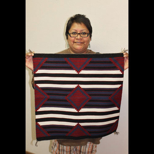 Elvie Van Winkle is an extraordinary rug weaver.  Her weave is flawless and her patterns are super crisp and clean.  In the good old days, the Chief pattern was the blanket of choice for high-ranking personages of nearby tribes.  Everyone who was anyone wanted a Navajo Chief Blanket to express his or her status. Elvie has taken the chief pattern to a much higher level of expertise than most weavers can accomplish.  This rug is an excellent example of a classic design with a quality weave.