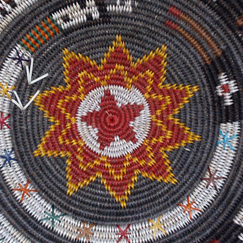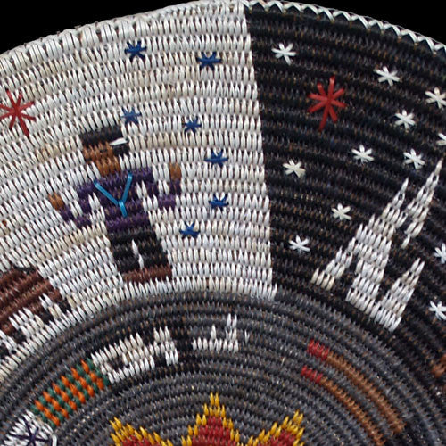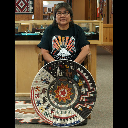 Peggy Rock Black has drawn inspiration from her Native legends and culture to weave a grouping of snapshots within her textural art form. Her "Collage" basket contains images representing legend, life ways, and ceremonialism and Navajo history all packed into one fantastic package. It is significant that Peggy places such important aspects of her people into her baskets in order to spark interest and open a dialogue to those issues on her mind and close to her heart. There are less than one hundred Navajo basket weavers left producing their craft these days and few are in the league of Peggy Rock-Black.