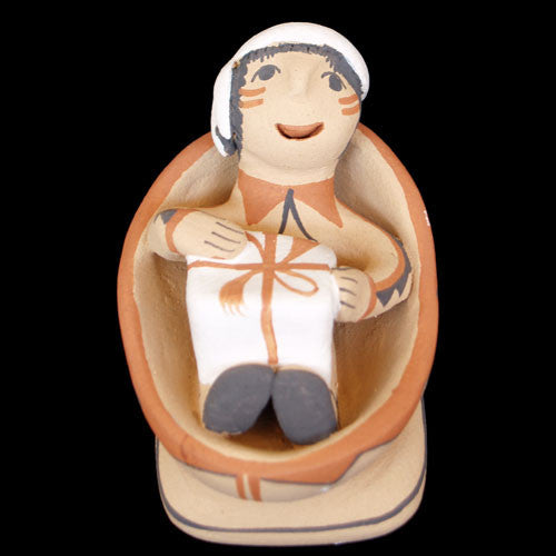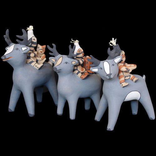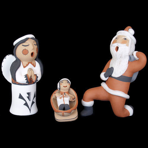 This nativity set is for in-store pick-up only. This whimsical portrayal of the holy nativity is completely hand-formed and crafted by Navajo/Jemez couple Leonard and Emily Tsosie. Reindeer have been replaced by mule deer and the Holy Men by the koshare. An angel prays and Santa sings over a gifted child. This is a wonderful set for those collectors in search of a new and creative interpretation of a well loved and often told story.