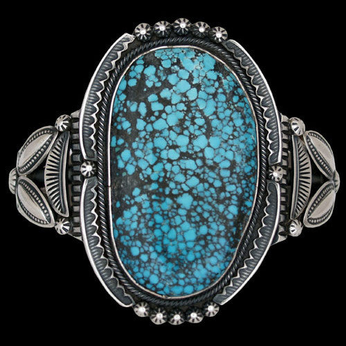 From high upon a mountaintop in central Nevada comes this sky blue turquoise with the name of Blue Diamond. The Blue Diamond mine has the ability of producing a super high grade of natural turquoise and this bracelet possesses just that. Toby Henderson has a passion for top-notch turquoise and loves to set it in traditional styles of Navajo jewelry. Toby's hand stamped, carved and formed sterling silver setting beautifully accentuates the amazing nature of this turquoise. "Shazam!"