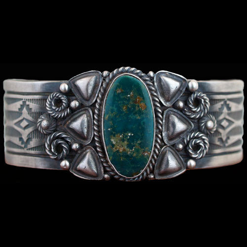 In his latest work, Eugene Livingston has revived a 1940s jewelry design, added his own twist of creativity and crafted a very nice wrist cuff. Eugene starts with sterling silver shot, heats it until molten and pours it into a bar. He then puts the bar through a heavy duty roller and mills it to the desired thickness. Using this process he makes his own silver sheet and wire in order to create his unique jewelry pieces. The solidity and strength of Eugene's jewelry allows it to wear better and last longer. This bracelet is set with a high grade, natural cabochon of Castle Dome turquoise from Globe, Arizona.