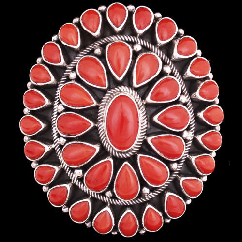 Coral, beautiful blood red coral, has been the object of desire for Navajo people since the Spanish arrived in the Southwest. Knowing this, Geneva Ramone has taken 21 stones from the deep and combined them into an elegant brooch for any occasion. This well designed and crafted pin is heirloom quality. Navajo people crave coral. You will too.