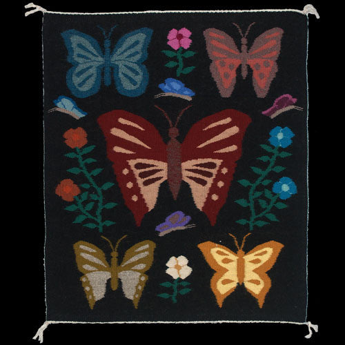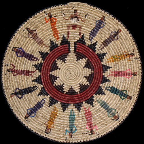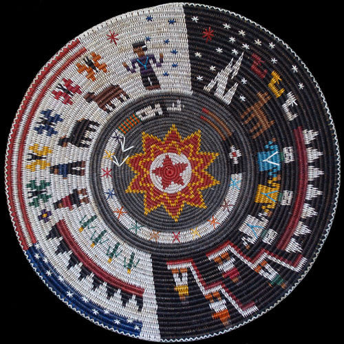 Peggy Black likes to mix motifs. In this weaving, she has adorned the traditional ceremonial basket pattern with butterflies, Navajo couples and the five petal squash blossom design. Peggy often refers to these as collage baskets because of this symbolic blending.