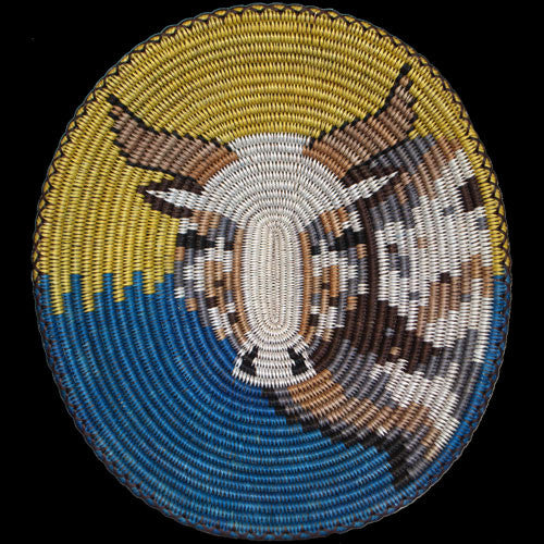 Peggy Rock Black has taken the Navajo ceremonial basket design and embraced it with an eagle motif. The ceremonial pattern is the embodiment of the Navajo universe, and the eagle guards, protects, and is a bridge for communication between humans and the Holy People. On the wings of the eagle are four levels of emergence and duality symbols. In a nutshell Peggy is recognizing the past, present and future of the Navajo people, all upon a woven storyboard.