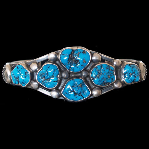 Victor Begay of Lukachukai, Arizona sometime in the 1970s, made this bracelet. It was bought by a collector from New York City as a gift for her husband. The bracelet sat in a drawer for nearly 40 years before it was returned to its homeland. We were more than happy to see it. Victor was a prolific artist in that period and produced jewelry of high quality set with top grade turquoise. The stones in this bracelet are from the Burnham mine near Austin, Nevada.