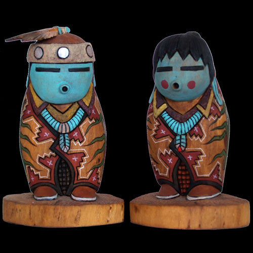 Dennis Ross creates people; short, chubby people with a story to tell. In this case, it is a corn family of 2 with husband and wife. These individuals inform us that the first Navajo people were created from corn and that corn remains an important aspect of Navajo life, as a food source, as a cultural staple and as a fertility symbol. Dennis is not afraid to put a lot of detail into his sculptures, and that is apparent from these carvings. Take them home, you will love them forever.