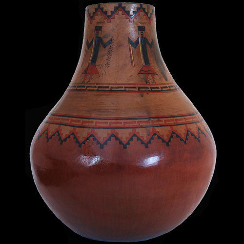 Nancy Chilly has embossed the Holy People upon this pottery vessel in order to honor them for being benevolent to her high desert people. Nancy creates pottery that portray the Yei-be-chei surrounded by textile patterns and sacred corn. She uses hand dug clay and pinion pitch to form and seal the pottery, the same way her ancestors did. Nancy's pottery is a fabulous example of how the Navajo culture effects their art.
