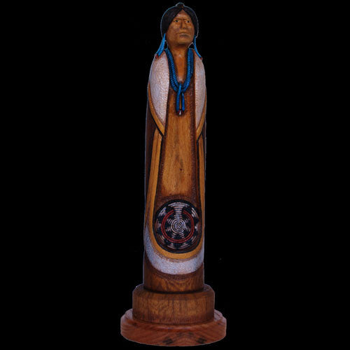 Dennis Ross, Navajo/Hopi artist, has the hands of a lumberjack and the carving ability of a sculptor. Because of his dual heritage Dennis often blends design and motif to craft his imaginative art forms. In this case Dennis has produced a sculpture that portrays a Hopi Butterfly Maiden that is believed to govern the spring and a Navajo Corn Spirit that allows growth of the most precious of food source. The combination of characters allows for a most attractive and appealing figure.