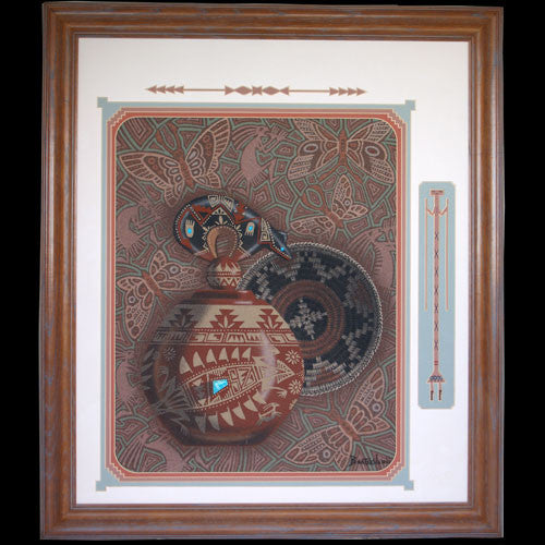 Eugene “Baatsoslanii" Joe is one of the all-time great Navajo sand painters. Early in his career he developed an intricate, contemporary style that distinguished him from all the others and spawned many copycats. Eugene’s work, however, is the standard. Carved pottery, Navajo ceremonial baskets, fetish animals and bits of natural gem grade turquoise are surrounded by complex butterflies, dancing Kokopelli’s and other finely detailed motifs. Eugene is the best.