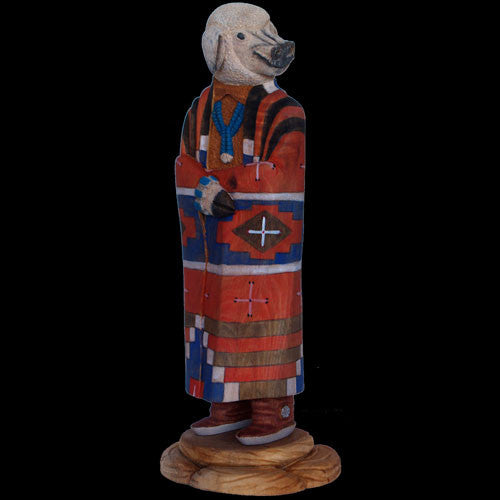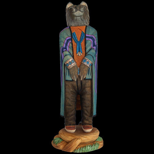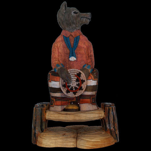 Over the past several years, Marvin Jim has developed a carving style all his own. Originally making reproductions of Hopi dolls, Marvin quickly switched his focus to Navajo cultural stories and found his niche. This wolf speaks of a time long ago when animals had human characteristics and enjoyed the company of man. You can see from the smile on this guy’s face it was a happy time.