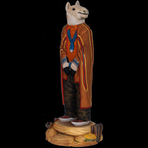 Marvin Jim is back at it, and his folk art is still both fanciful and meaningful. In this case Marvin reminds us that animals once walked with humans and helped make the fourth world habitable for all life forms. Then man, in his infinite wisdom, said or did something to insult the animals. The creatures discarded their garb and returned to the wild, ignoring the shortsighted arrogant two-legged beings they once embraced. Marvin's sculptures remind us that important and treasured relationships can be destroyed in the briefest of thoughtless moments. Guard and protect your valued alliances, they are worth more than material things.