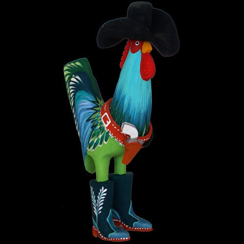 Matthew Yellowman has created his own style of complexly carved and painted folk art. Matt’s detail work is better than most, and his distinctive humor makes his carvings fun to have in the store. You will love displaying this gun slinging outlaw rooster in your personal art collection.