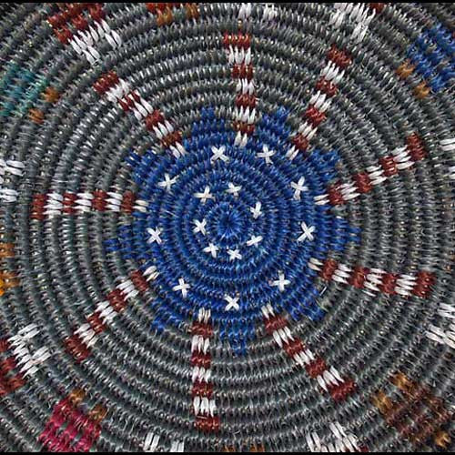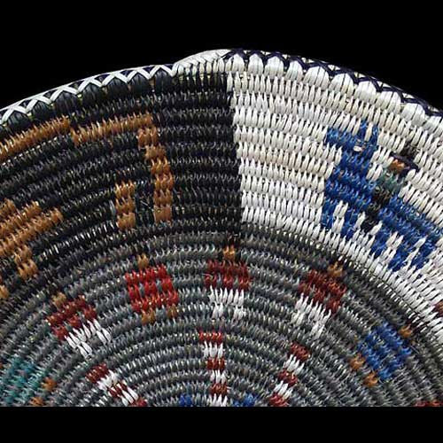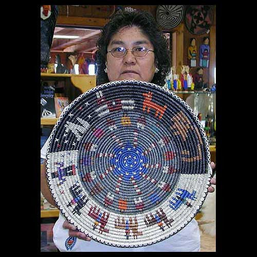 Peggy Rock Black's Collage basket is a whole lot of fun and fantasy all wrapped-up in one finely woven package. Through the creative process, Peggy instructs us how First Man and Coyote placed the constellations and Milky Way in the heavens. She introduces us to the riders of the Enemy Way, the Home of the Buffalo People, sacred ceremony, balance, harmony and much, much more. Through the art of Navajo basketry, Peggy uses pictorial images as a way of promoting tradition and culture.