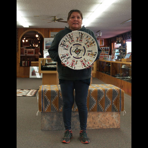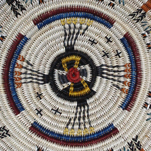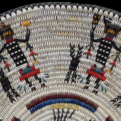 Lorraine Black likes sand painting motifs and often incorporates them into her basketry. Maybe that is because of their healing powers, or maybe it’s because of the fine detail associated with this curative medicine. In either case, both these elements are apparent in her Sky People basket. Fine detail combined with careful weaving makes this an exceptionally interesting basket.