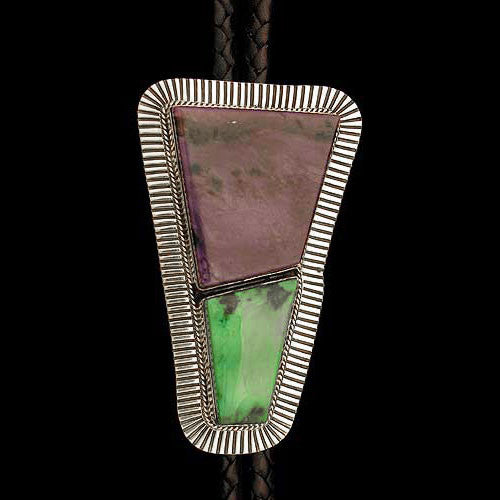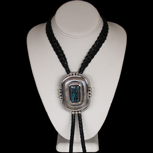 Allison Snowhawk Lee has taken a wonderful piece of gem-grade Morenci turquoise and mounted it in one of his classically beautiful hand-fabricated, sterling silver settings. Allison is the most refined finish artist we know, and one of the best all around silversmiths. Who better to set a remarkable stone than a remarkable artist? Beauty, rarity and durability are the three attributes that distinguish a quality, collectible piece of art. All three are definitely present with this amazing bolo tie.