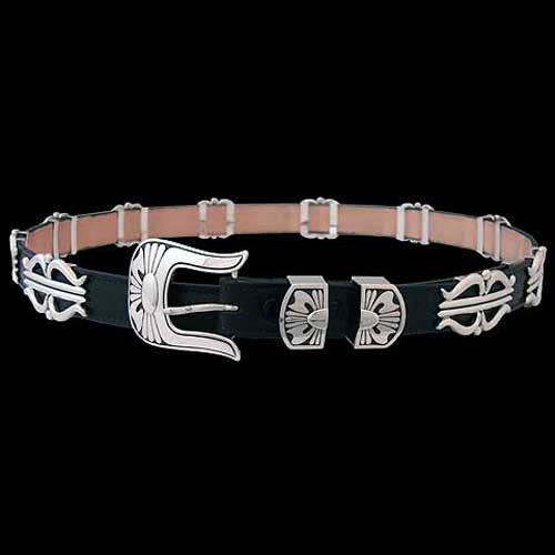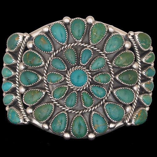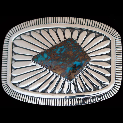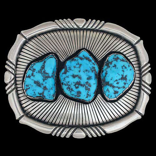 As our dear old Daddy is fond of saying: "You can see that buckle coming like a headlight on a freight train." Calvin Martinez is noted for his heavy-duty silver work and his love of bright, colorful turquoise. In this case he chose a threesome of some stunning high-grade natural turquoise from the Sleeping Beauty Mountains of Globe, Arizona. Cut in the nugget style, these stones standout. Calvin built this buckle to withstand the test of time; it will be causing a commotion for a long time to come.