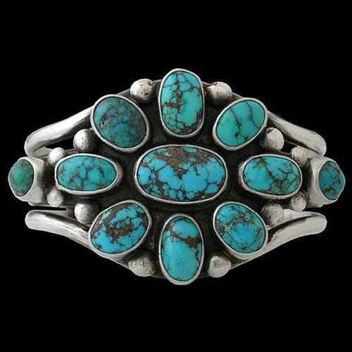 Harold Bicenti has a way with Skystone and silver. He hand fashions and crafts attractive objects of wearable art from rare and valuable elements of the Earth herself. Sterling silver and turquoise jewelry has been loved and cherished by the Navajo people since Spanish silversmiths first taught them how to set their precious turquoise into its warm embrace. Harold has found an extremely nice suite of China Mountain Turquoise and lent his considerable talent to crafting a most wonderfully traditional style wrist band.