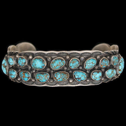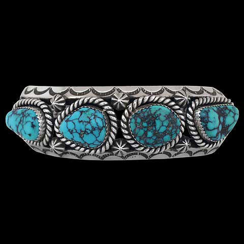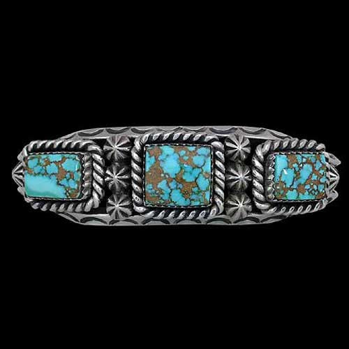 Harold Becenti derives from Little Water, New Mexico, a small Navajo enclave in northwestern New Mexico. He was born in 1964, but did not acquire his smithing skills until in his twenties, learning from his mother, Emma Bighand, as well as a girlfriend, Harold has developed a classic style of heavy silver jewelry featuring deep, precise stampwork and natural turquoise stones.