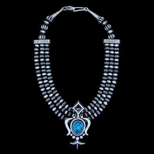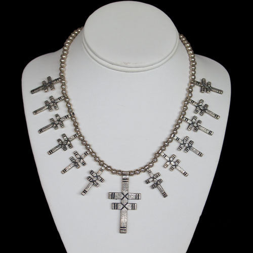 Spanish artisans first introduced the Navajo people to silversmith work and the pattern of the cross. Since that time the cross has been one of the most recreated designs in Navajo art. Harrison Jim mastered the art of casting designs in tufa stone years ago and does it very well. By using the widely accepted symbol of the double cross, Harrison has created a necklace to honor tradition and culture that spans the ages.