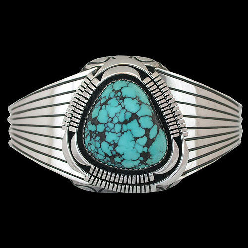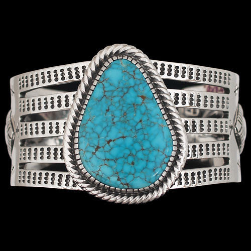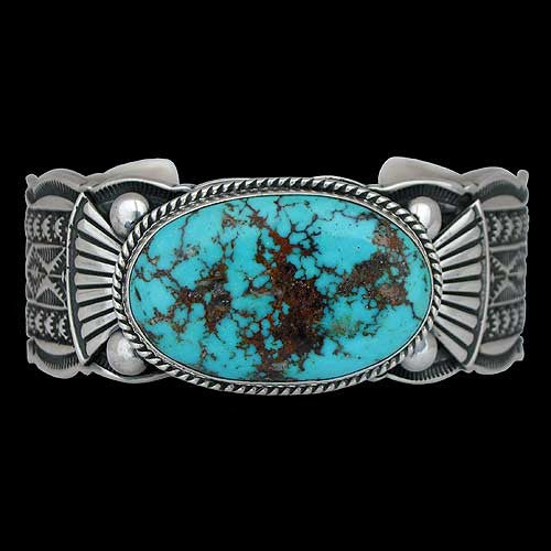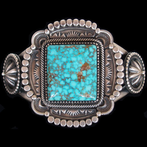 Guy Haskie is known for his deeply precise and precisely deep silver stamping and his choice of topnotch stones. In this bracelet, Guy has placed a monster cabochon of blue-green Burnham turquoise on a hand-stamped shank and brought us a bracelet anyone with an eye for fashion will be proud to own and wear.