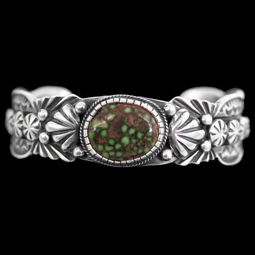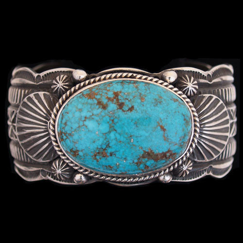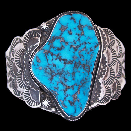 Like the intricate pattern of a diamondback rattlesnake, the design on this Guy Haskie bracelet is mesmerizing. Intricate stamping sets off a beautiful and large natural, gem grade Burnham turquoise stone. Guy is well known for his silver smithing talents and has used them to great effect in this stunning cuff. This is a piece that will make any turquoise jewelry lover happy.