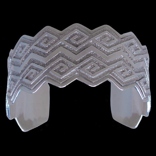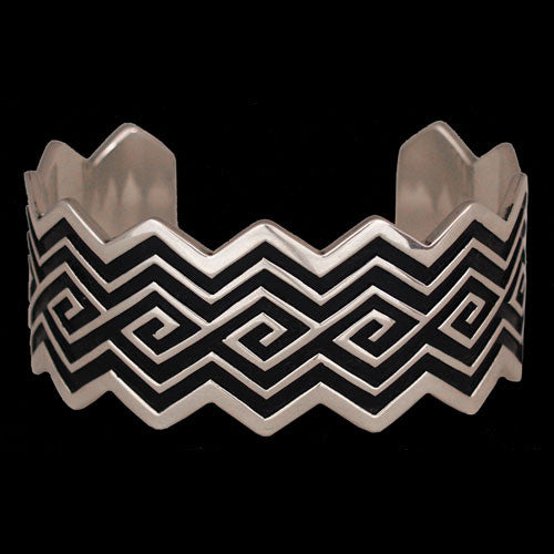 Navajo artist Ray Scott titled this water inspired bracelet "Twin Falls". This free flowing wrist band is hand fabricated of sterling silver and is reminiscent of the life giving liquid so essential to regeneration and proliferation on this semi-arid landscape. Moisture is a must when you are gifted a mere six inches annually. Ray is inspired by the forces of nature and we benefit greatly from those revealing revelations.