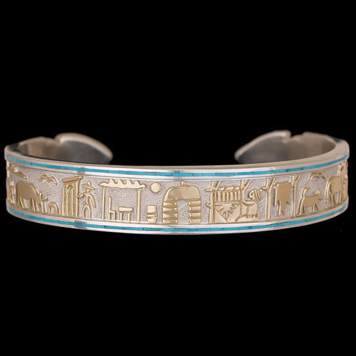 In his latest work, Eugene Livingston has revived a 1940s jewelry design, added his own twist of creativity and crafted a very nice wrist cuff. Eugene starts with sterling silver shot, heats it until molten and pours it into a bar. He then puts the bar through a heavy duty roller and mills it to the desired thickness. Using this process he makes his own silver sheet and wire in order to create his unique jewelry pieces. The solidity and strength of Eugene's jewelry allows it to wear better and last longer. This bracelet is set with a high grade, natural cabochon of Castle Dome turquoise from Globe, Arizona.