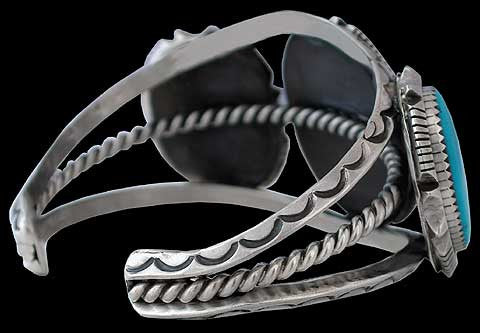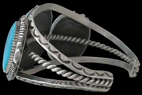 From high upon a mountaintop in central Nevada comes this sky blue turquoise with the name of Blue Diamond. The Blue Diamond mine has the ability of producing a super high grade of natural turquoise and this bracelet possesses just that. Toby Henderson has a passion for top-notch turquoise and loves to set it in traditional styles of Navajo jewelry. Toby's hand stamped, carved and formed sterling silver setting beautifully accentuates the amazing nature of this turquoise. "Shazam!"