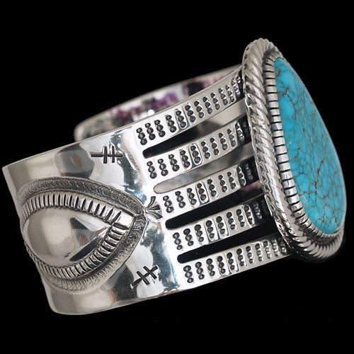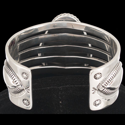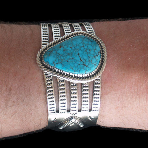 Super high-grade, natural, water-web Morenci turquoise is the centerpiece of this remarkable cuff bracelet by Navajo artist Allison Snowhawk Lee. Made in the traditional style, the bracelet is heavy, well made and unusually attractive. Allison is one of the most refined silversmiths of the modern age; his finish detail is enviable and his choice of turquoise top-drawer. When looking for collector-quality jewelry from a Native American artist, look no further than Allison Lee.