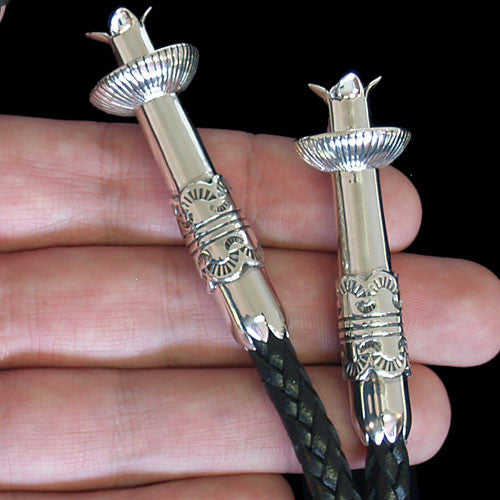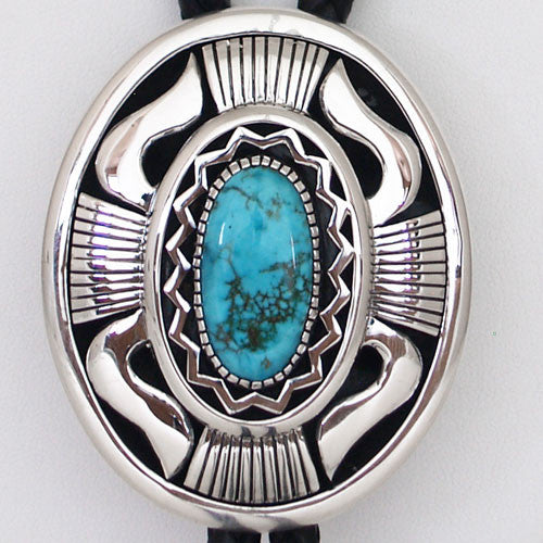 Allison Lee is surely one of the most talented silversmiths we have ever run into. When you connect him with turquoise from Barry’s private reserve; well, the result is, as you see, SPECTACULAR. Sorry for shouting, but this oval piece of high-grade Blue Gem fits right into Allison’s carved and stamped Ketoh design. It is a rare individual who can fabricate bolo ties of this quality. Both Allison and his jewelry are extraordinary.