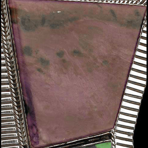 Albert Jake decided to take a hunk of sugilite and a hunk of Persian turquoise and make a contemporary bolo tie that is timeless in its design. Albert knows you don’t want to complicate the silver work when you have stones like this. He has therefore used clean, simple stamping and a foundational shape to show off his skills. Very nice indeed.
