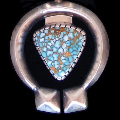 Squash blossom necklaces have been an integral part of the Navajo culture a long time, and Allison Lee’s work has been an important part of our collections for a long time. Allison makes some of the best Southwest jewelry you will find. In this case he has located a nice piece of Number 8 turquoise and matched it with his unbeatable silver work. Nice? No, it is much better than that! Spectacular is a more appropriate way to describe this all hand-made piece.