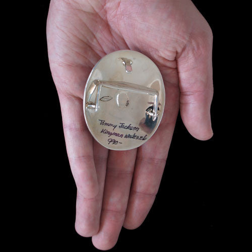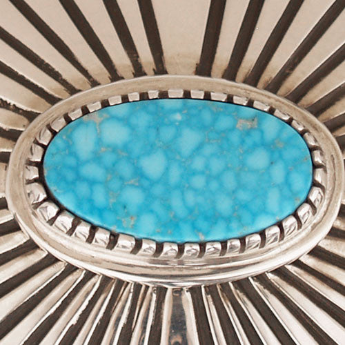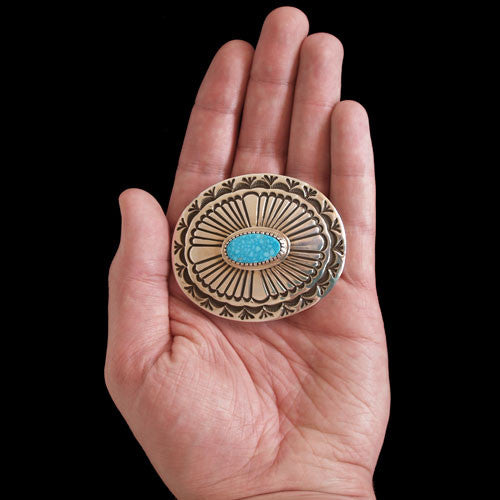 Tommy Jackson often arrives at the trading post on his Harley-Davidson iron horse motorcycle. Once he lands in the parking lot, we are eager to see what he carries in his saddlebags. In this case it was a nicely stamped oval buckle with a beautiful piece of water web turquoise from Kingman, Arizona. Ride on.