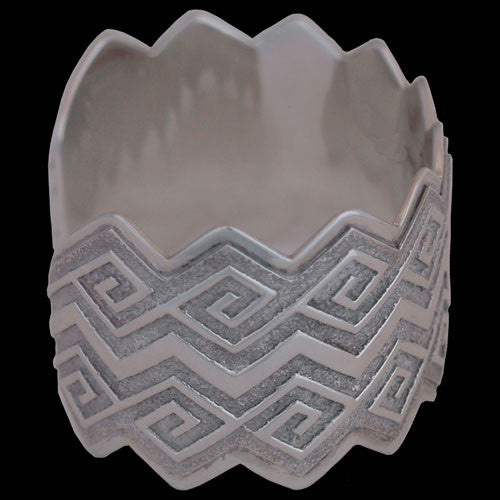 Navajo artist Ray Scott titled this water inspired bracelet "Twin Falls". This free flowing wrist band is hand fabricated of sterling silver and is reminiscent of the life giving liquid so essential to regeneration and proliferation on this semi-arid landscape. Moisture is a must when you are gifted a mere six inches annually. Ray is inspired by the forces of nature and we benefit greatly from those revealing revelations.