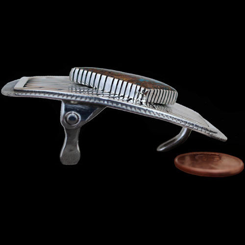 Oh, Allison Lee the silversmith, who never, never, never disappoints. His work is so classically clean it makes you weep. Using a 24.3 carat piece of Tyrone turquoise and his hallmark stamping, Allison has hammered out a buckle that would make anyone shine.