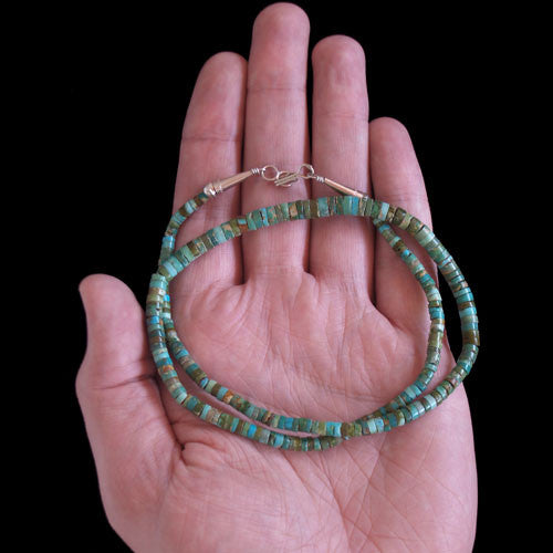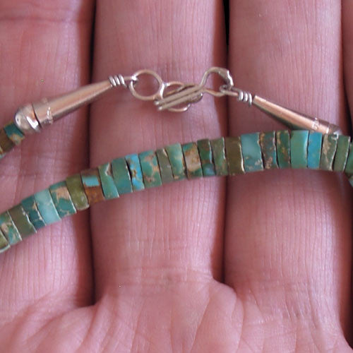 The turquoise in this necklace is high-grade and natural, which is exactly what Ray Lovato loves to work with. The turquoise is from Nevada Cassidy's, Stone Mountain mine in Nevada. The turquoise from this location is often found in small pieces, what Ray likes to call "corn flake turquoise," because that is what it looks like in the rough. It is perfect for Ray to shape his beads from and the end result is . . . well . . . perfect!