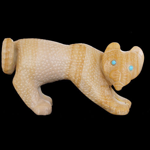 In Zuni culture fetish carvings represent animals spirit, which reside in the stone. The less animate an object, the closer to the spirit world it is. A stone carving of an animal brings its owner in contact with the applicable deity. Wilford Cheama has carved an exceptional representation of a mountain lion, also known as "Elder Brother”. Fashioned of brown serpentine, Wilford's mountain lion displays all the grace and beauty of this magnificent animal. It looks as if the lion is ready to spring into an all-out sprint at any moment.