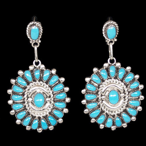 Just when we thought there wasn't any more Sleeping Beauty turquoise left in Zuni, New Mexico; Lorraine Waatsa came up with some. What we appreciate about her discovery is that she shared her treasure with us. Lorraine created this bright and beautiful pair of cluster earrings and we were there to swoop in and grab them up. How fun is that?