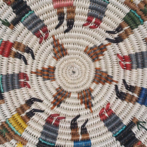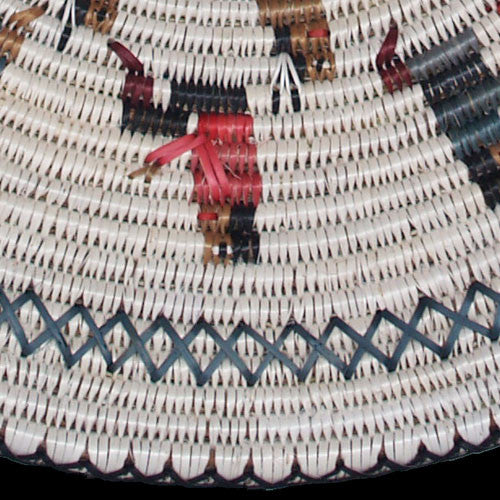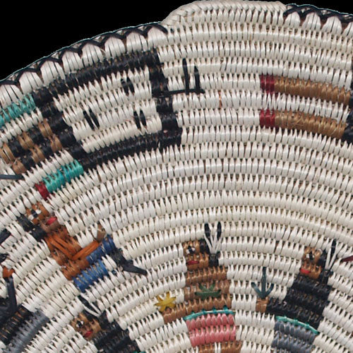 "At the sing," is a representation of the Mountain Chant ceremony practiced by Navajo people. It is a traditional ceremonial activity based on purging negativity from the body and mind. The dance is conducted inside a green circle of branches embraced by the Holy People. Participants sing and sway around a large, hot fire. The Mountain Chant is one of the few remaining ceremonies still being practiced in Navajo-land and it is taken seriously. Lorraine Black is an excellent weaver, and this basket is an exceptional example of her highly developed skill set.